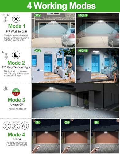 Modalità 4: la luce si accende regolarmente 1H/2H/3H. Inoltre, nelle modalità 1 e 2, la durata dell'illuminazione: 45S/90S/120S/5MIN/10MIN e la distanza di rilevamento: 6M/9M/12M. In tutte le modalità, la luminosità può essere regolata.
