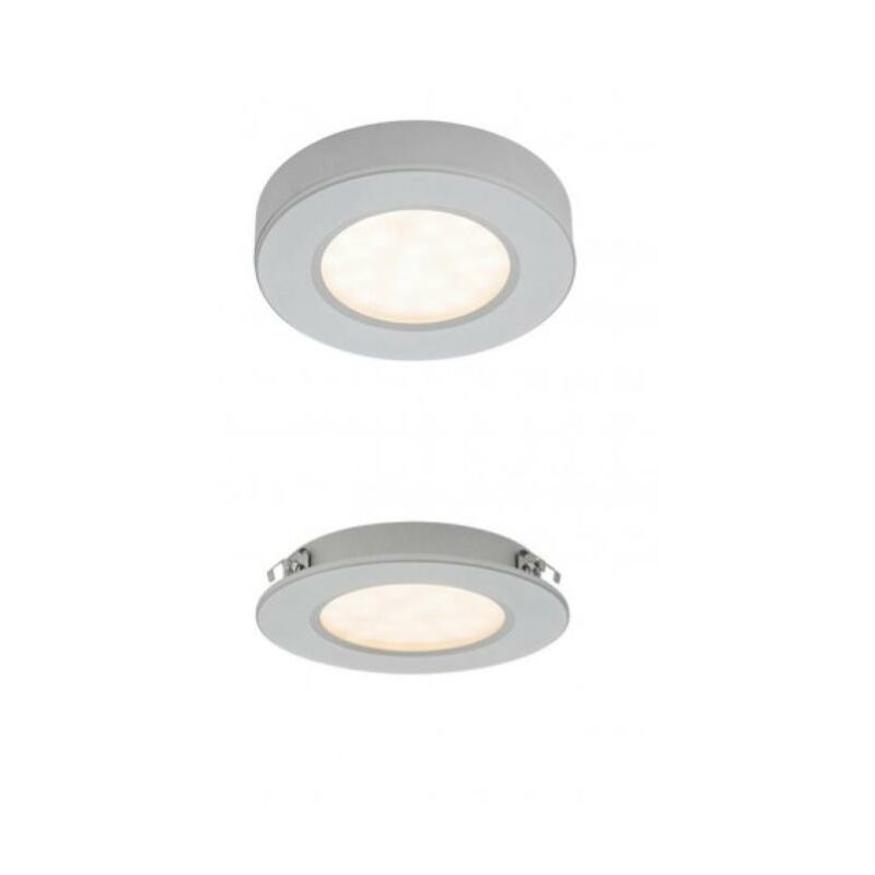 Spot LED SMD per montaggio ad incasso o da superficie, realizzato in alluminio di colore argento, con driver incluso. Le caratteristiche del rispettivo modello delle foto sono: Materiale: alluminio Colore: argento Potenza: LED SMD 3W 3000K CRI 85 Flusso LED 405 lm Flusso luminoso 330 lm Voltaggio: 230 V, 50 Hz IP20