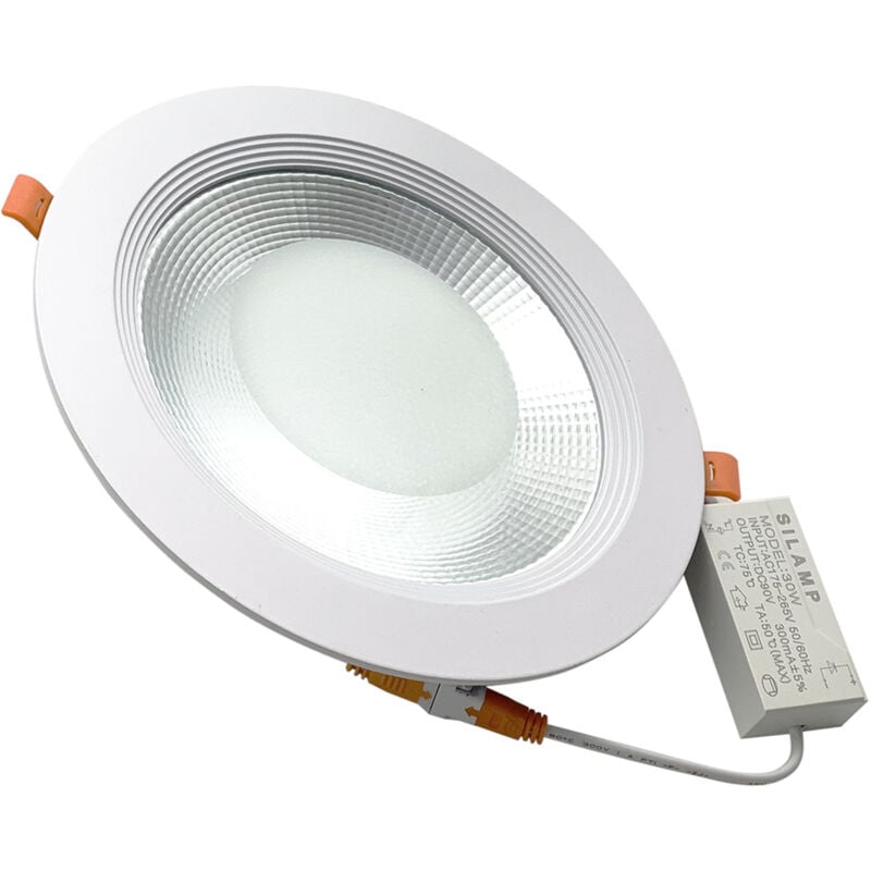 Faretto da Incasso 30W COB LED diametro 225mm driver incluso F.I.195-215mm Faretto da Incasso 30W COB LED molle e driver incluso diametro 225mm Il faretto a led ROTONDO BIANCO da 30W dal design semplice ma moderno, è fabbricato in alluminio di alta qualità che contribuisce a rendere minima l'emissione del calore e a migliorare la durata, stimata a circa 20.000 ore di vita media. Ideale per un utilizzo sia commerciale che domestico grazie al suo diffusore opalescente che non produce abbagliamenti o fastidi alla vista ma una luce chiara e semidiffusa con un angolo di 40°. Con il suo COB LED integrato, produce una luminosità di 3000 lm, equivalente a circa 300W di una lampada tradizionale, oltretutto grazie al suo elevato indice di resa cromatica (CRI) riproduce fedelmente i colori. Di facile installazione essendo molto sottile, si può collocare in controsoffitti con poca altezza, inoltre il faretto viene dotato di due alette a incasso e di trasformatore per funzionare a una tensione di