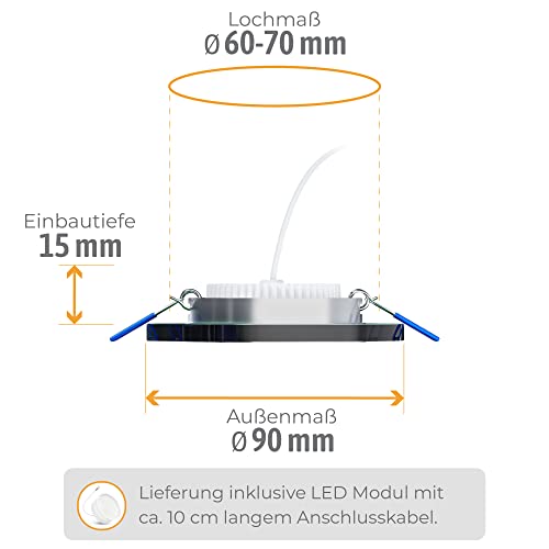 Dimensioni: Profondità di montaggio molto ridotta con lampada solo ca. 15 mm - Diametro esterno 90 mm - diametro foro 65 mm | Montaggio facile della lampada senza anello elastico.