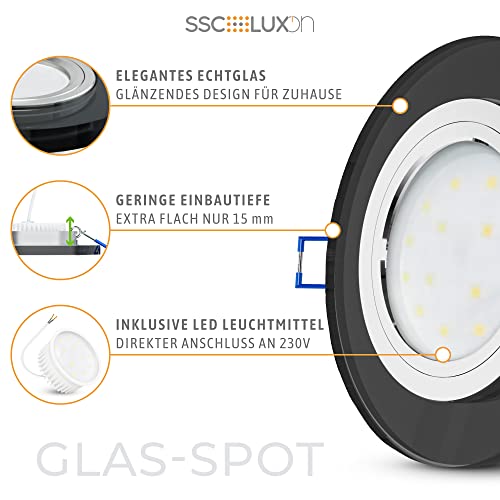 Accattivante LED da incasso in vero vetro nero. Un punto luce speciale nel vostro ambiente di vita e di lavoro. La lastra di vetro satinato opaco fornisce una luce piacevolmente morbida e priva di abbagliamenti.