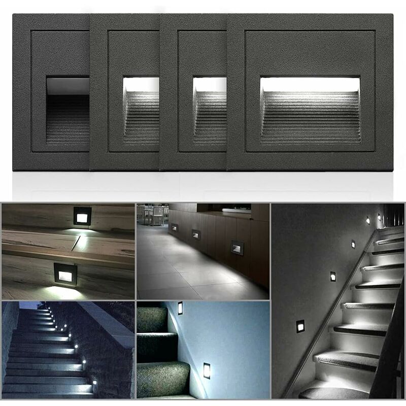 Materiale: realizzato in alluminio pressofuso di alta qualità con raffreddamento passivo, ha una lunga durata IP65 impermeabile, resistente alla polvere e all'umidità. Puoi installare le luci all'interno e all'esterno. Illuminazione scale a LED versatile, unisce decorazione e praticità. Puoi creare un'atmosfera piacevole con un'illuminazione squisita. Facile da installare: nella confezione è presente una scatola da incasso corrispondente per ogni lampada. L'installazione è più comoda e stabile. Può essere installato su marciapiedi, corridoi, scale, ingressi, oppure direttamente in casa, ma anche a parete. Materiale custodia: alluminio pressofuso Voltaggio: AC85-265V Tipo di cordone della lampada: COB Potenza: 3W Temperatura colore: 6000-6500K Flusso luminoso: 110LM / W CRI: 80 Grado di impermeabilità: IP65 Colore guscio: nero Accessori: guscio di montaggio inferiore bianco