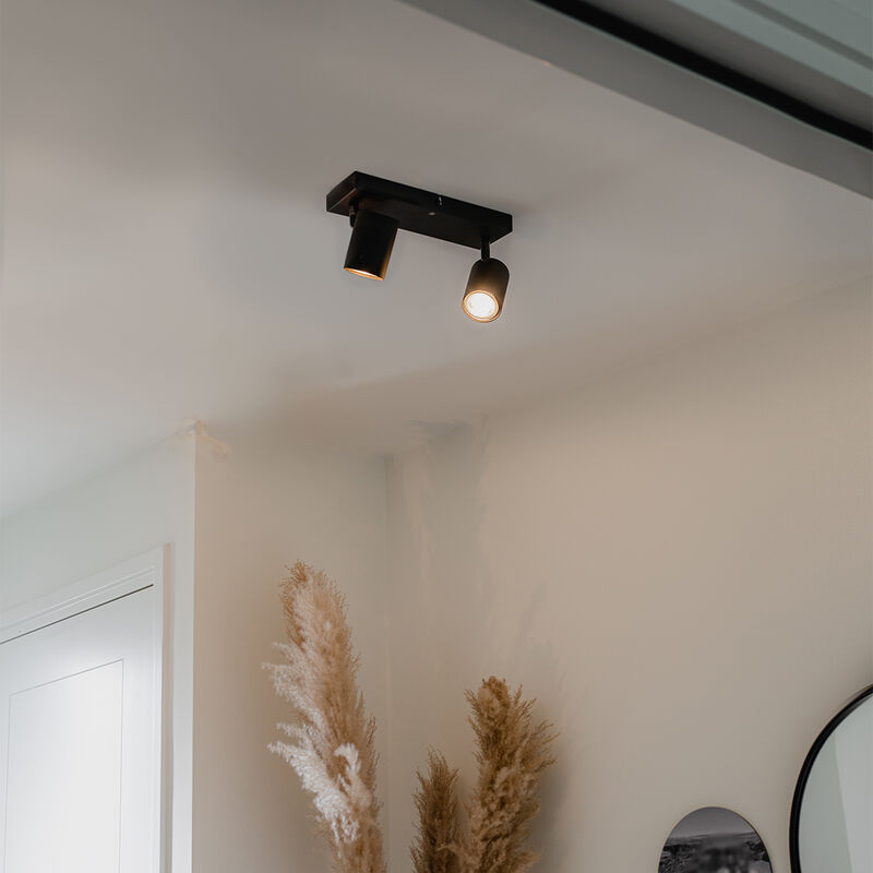 QAZQA Plafoniera moderna nera a 2 luci orientabile - JEANA Dai una spinta ai tuoi interni con la plafoniera JEANA. Il suo colore nero assicura che aggiunga un tocco moderno e industriale ai vostri interni. La plafoniera ha un'altezza di 13 cm, una lunghezza di 26 cm e una larghezza di 8 cm. La piastra di montaggio ha un'altezza di 2,5 cm, una lunghezza di 26 cm e una larghezza di 8 cm. Completa JEANA con due lampadine GU10 (max. 35 watt). Assicuratevi di ordinarle separatamente. I paralumi hanno un diametro di 5,7 cm e un'altezza di 8 cm ciascuno. JEANA è dimmerabile con un dimmer esterno (non incluso). Questa plafoniera nera è perfetta per il soggiorno, la camera da letto o la sala da pranzo. I due faretti possono essere regolate separatamente, in modo da scegliere sempre dove la luce risplende - JEANA è quello che stai cercando! Portalampada: GU10 . Max 2 x 35 W, 230 V Adatto a: Algogene, LED Voltaggio: 220V/230V IP Classe di protezione: [IP20] A prova di polvere Funzioni extra