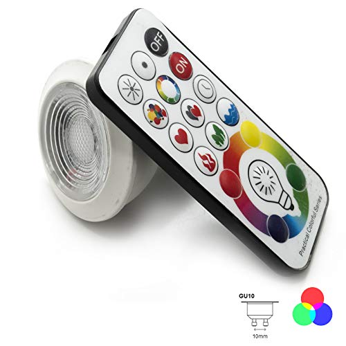 Disponibile con lampade: 1x Lampada LED 8W: attacco GU10 per una potenza 8W - con temperatura luce 3000K - 4000K- 6000K | 1x Faretto RGB GU10 con telecomando IR - 16 colori di luce disponibili + 4 programmi di colore + dimmer + on e off. Angolo emissione luce: 60 gradi. Ideale per la cromoterapia di ambienti interni