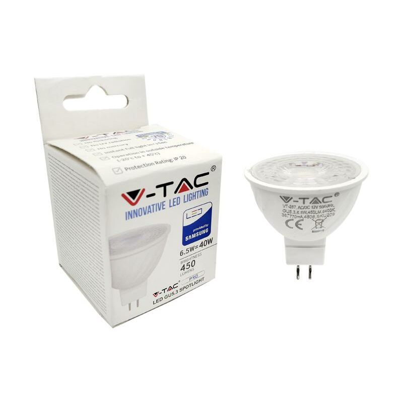 LED Faretto SAMSUNG Chip GU5.3 6.5W MR16 Ripple Plastica 38' 4000K SKU: 208: VT: VT-267 Caratteristiche del prodotto 80% di consumo energetico in meno rispetto alle lampadine standard Lunga durata Nessuna emissione di radiazioni UV e radiazioni non ionizzanti Accensione immediata, nessun tempo di riscaldamento Bassa potenza termica Direttamente sostituibile alle lampade ad incandescenza tradizionali Installazione Aree Commerciali e Residenziali Hotel, Bar Stand espositivi Lampadari Allaperto, esclusivamente allinterno di apparecchi idonei. Specifiche tecniche Informazione generale Attacco MR16/GU5.3 Tipo Lampadina PAR16 Tipo LED SAMSUNG Chip Vitamedia 30000 ore Dati elettrici Potenza 6.5W Potenza EQV. a incandescenza 40W Tensione AC/ DC 12V Dati tecnici luce Fascio Luminoso 38° Colore della luce Bianco naturale Temperatura di colore 4000K Flusso luminoso (lm) 450 lm Indice di resa cromatica Ra >80 Dettagli corpo Materiale Plastica Funzionalità IP Protezione IP20 Tempo innesco 100%