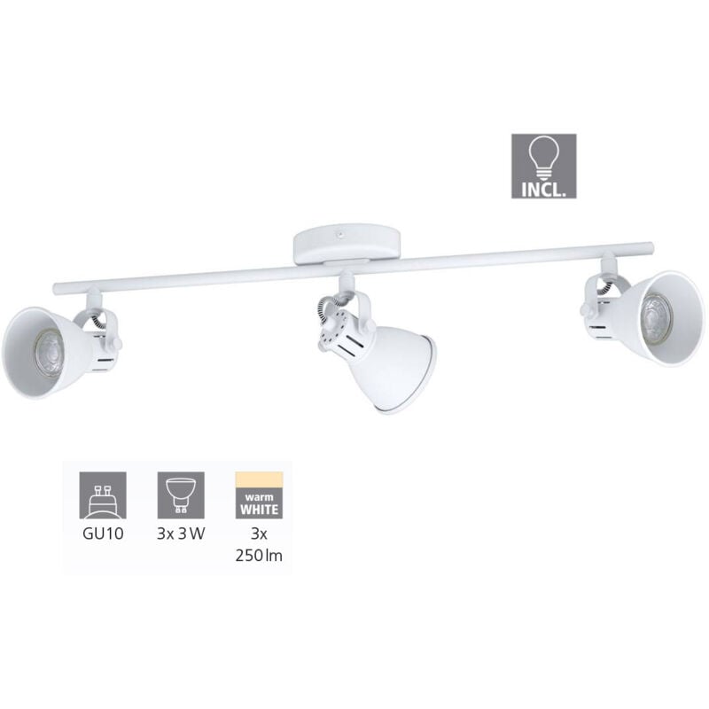 Lampada con 3 faretti led per Interno Eglo: Seras Caratteristiche: Modello: Faretti Segmento: Indoor Materiale imballo: Metallo Colore involucro: Bianco Tipo lampada: GU10-LED Tipo presa: GU10 Numero luci: 3 Lampadine incl.: INCLUSE Tipo di interruttore: Senza interruttore Batteria: No Dimensioni: Lunghezza articolo (in mm): 595 Larghezza articolo (in mm): 65 Peso netto: 1,34 Kg Illuminazione: Flusso luminoso nominale (in lm ): 240 Wattaggio max (1): 3 x 3.3 W Equivalenza con lampada a incandescenza (W):40 Angolo di proiezione (in °): 38 Temperatura colore: 3000K bianco caldo Durata nominale (in ore): 15000 Cicli di accensione: 15000 Indice di resa cromatica (Ra, CRI): >80 Classe di efficienza energetica: A+ Wattaggio misurato (precisione 0,1 W ): 3 Tolleranza di colore (LED, SDCM)