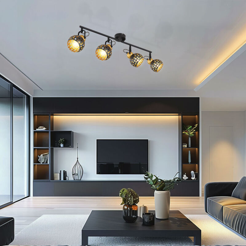 Descrizione Questo faretto da soffitto è un'aggiunta elegante ai tuoi interni. Il faretto lungo 60 cm è composto da due aste in metallo nero, ciascuna con due prese E14 orientabili ricoperte da cupole in metallo color oro. Puoi equipaggiarli con lampade adatte a tua scelta. Questo ti dà la possibilità di determinare individualmente il colore e la luminosità della luce. Inoltre, un bellissimo motivo viene proiettato attraverso i quattro paralumi in metallo nero e dorato con numerose punzonature triangolari. Con altri modelli della stessa serie puoi completare il quadro complessivo delle tue quattro pareti. Le lampadine non sono incluse nella fornitura. Particolare lampada • Tipo di lampada: lampada da soffitto • Materiale: metallo • Colore: nero, oro • Punti mobili • 4 fiamme • Grado di protezione: IP20 • Lunghezza x larghezza x altezza: 60x10x17,5 • Prese: 4x E14 • Lampadina inclusa: n • Potenza della lampada: 4x massimo 40 watt • Voltaggio: 230V, 50Hz