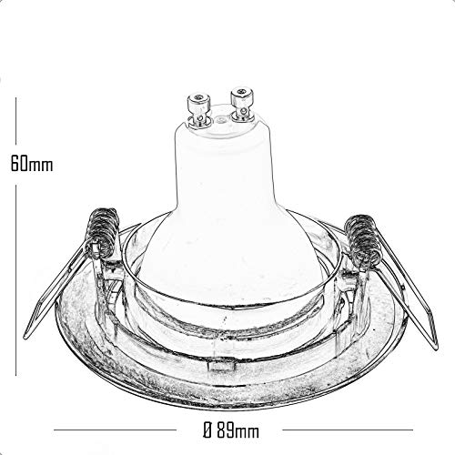 Dimensioni consigliate per il foro dell'incasso: 70mm - Dimensioni esterne: 89mm x H 60mm. Nella confezione è incluso l'attacchino GU10