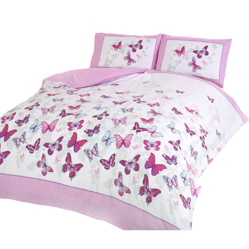 Questo grazioso set copripiumino e federa con farfalla presenta una collezione di farfalle rosa, viola e turchesi su uno sfondo bianco e grigio. Il copripiumino e le federe hanno anche un bordo a pois rosa e bianco che viene portato sul retro del set di biancheria da letto. Questo articolo è realizzato in misto cotone ed è adatto per il lavaggio in lavatrice e adatto all'asciugatrice.