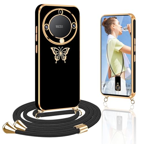 Farfalla Cover per Honor Magic 5 Lite 5G con Cordino, Custodia per Honor Magic5 Lite Case con Collana Antiurto Silicone Cover con Laccio Tracolla Protettiva Case con Collana per Magic 5 Lite 5G, Nero