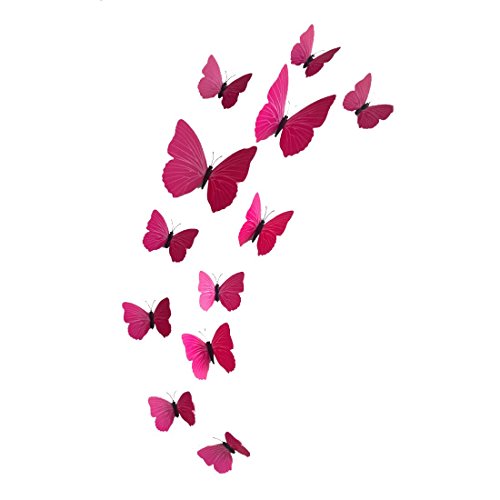 Farfalle in stile 3D, 12 pezzi, decorazione da parete con punti adesivi per il fissaggio, mix di rossi rose