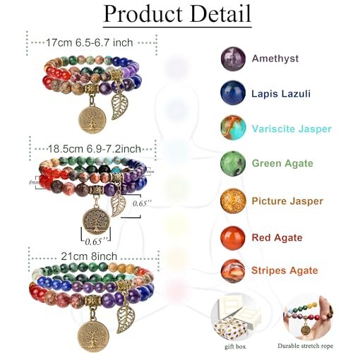 Dimensioni del braccialetto: la lunghezza totale del braccialetto di perline: ca. 6,3 pollici. Perline: bracciale in pietra naturale con ciondolo albero della vita da 8 mm. Bracciale in pietra naturale da 6 mm con pendente a foglia. L'oggetto pesa circa 33-37 grammi per chakra.