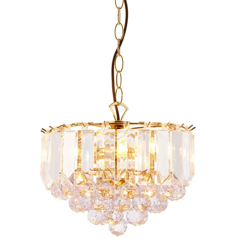 Endon Fargo - Sospensione a soffitto a 3 luci in acrilico, ottone, E14 | Finitura: acrilico, ottone | Materiale: acrilico, acciaio | Classificazione IP: IP20 | Altezza (cm): 114 | Diametro (cm): 30,5 | Numero di luci: 3 | Tipo di lampada: E14 | Lampadina: Golf | Dimmerabile: sì