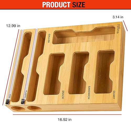 Farsina Ziplock Organizer 6 in 1 Foil and Plastic Wrap Dispenser con taglierino Ziplock Bamboo Bag Organizer per Kitchen Drawer Ziplock Organizer Adatto per Gallon, Quart, Sandwich, Snack