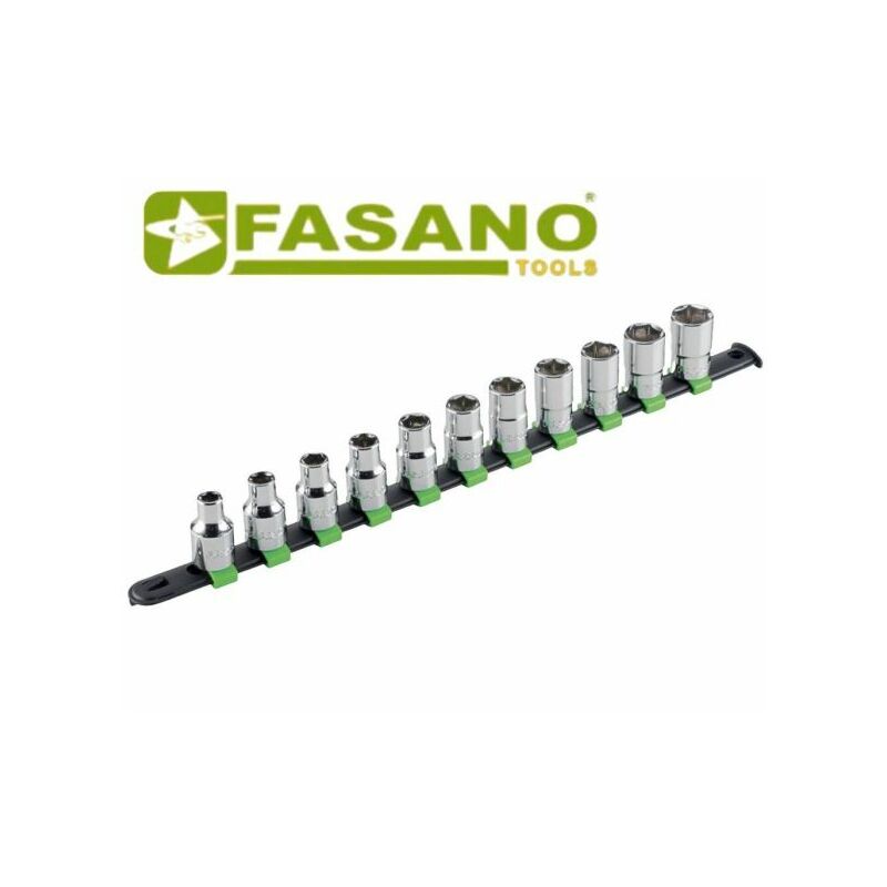 SET 11 CHIAVI A BUSSOLA ESAGONALI 1/2 FASANO TOOLS FG 625A/S11 CONTENUTO DELLA CONFEZIONE: SERIE 11 BUSSOLE ESAGONALI MISURE: 8, 10, 11, 12, 13, 14, 15, 16, 17, 18, 19 mm - Fornito su listello e clip in ABS dotate di sfere di tenuta - Listello dotato di gancio di appendimento e linguetta fine corsa per evitare la caduta accidentale degli utensili.