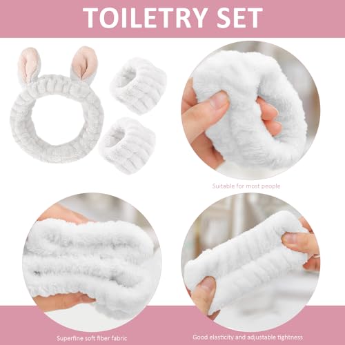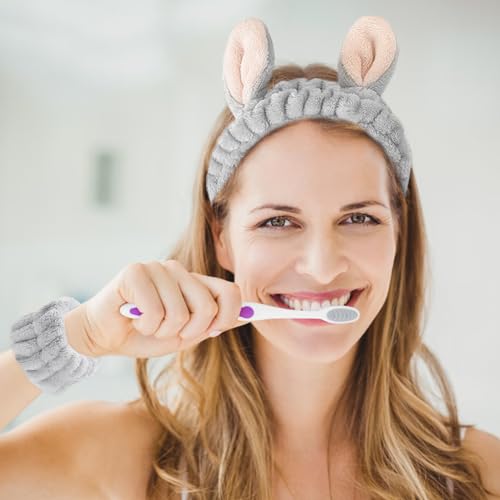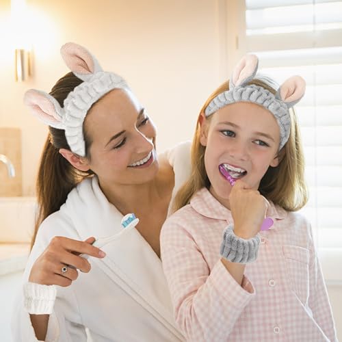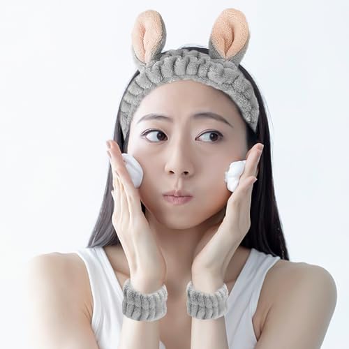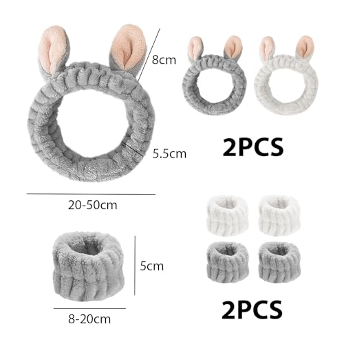 Set di 2 fasce per capelli con orecchie di coniglio con 4 fasce da polso, da donna, fasce elastiche per capelli, per lavare il viso, trucco, bagno (bianco, grigio)