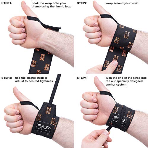 Ultraforte e regolabile: Le fasce per polsi WBCM per uomini e donne sono facili da indossare e togliere grazie alla cinghia elastica e al sistema di ancoraggio. Basta far scorrere i pollici attraverso le asole per i pollici e avvolgerle intorno ai polsi. Solleva di più con le nostre fasce da sollevamento e non sentire più dolore al polso.