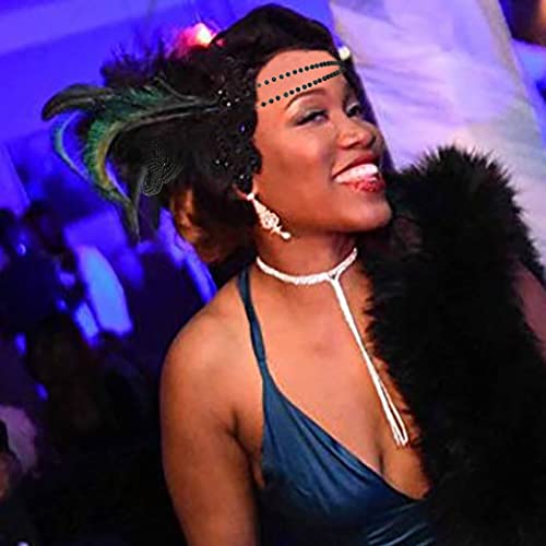 Fascia per capelli retrò in cristallo decorata con una classica piuma nera, la fascia elastica collega la catena di strass e la squisita fattura è affascinante. Renditi la persona più brillante nella festa a tema Gatsby.