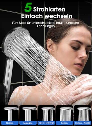 【5 modalità di spruzzo】 Questo soffione offre cinque diverse modalità di spruzzo, consentendoti di personalizzare la tua esperienza di doccia. Puoi scegliere tra getti a pioggia rilassanti, getti concentrati per massaggi mirati, nebbia rinfrescante, getti misti o la modalità risparmio idrico che riduce i consumi.è perfetto per adulti, bambini e persino animali domestici. Goditi un'esperienza di doccia veramente lussuosa con il soffione doccia ad alta pressione FASDUNT.