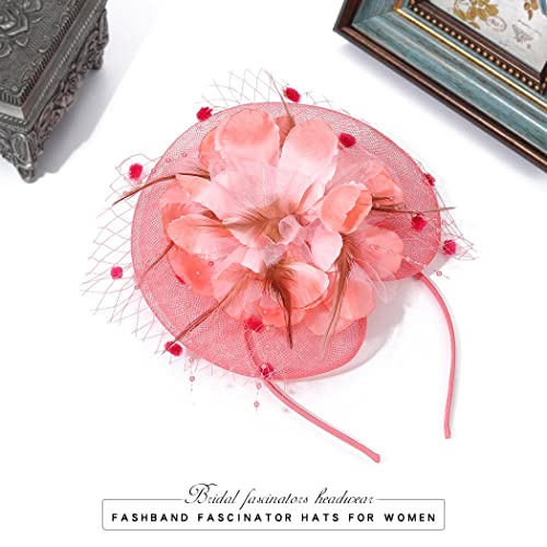Fashband Feather Fascinators Cappello Flower Headband Clip Mesh Cocktail Copricapo Tea Party Matrimonio per Donne e Ragazze(Rosso Corallo)