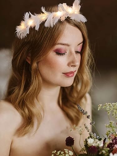 Il copricapo in piuma è realizzato in piuma d'oca di alta qualità, resistente e non sbiadisce facilmente, più bello ed elegante. Accessorio per capelli da festa con 10 luci a LED, abbastanza luminoso, sicuro e comodo da indossare.