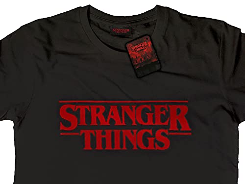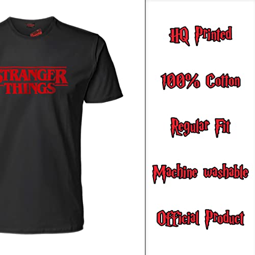 Fashion UK T Shirt Nera Logo Stranger Things. Nero Rosso. Maniche Corte. 100% Cotone. Unisex. Prodotto ufficiale. Taglie da Adulto Ragazzo. (M)