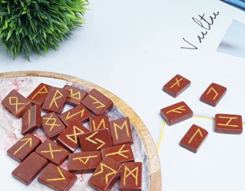 FASHIONZAADI Set di Pietre di Diaspro Rosso Naturale con Alfabeto runico Futhark Forma Rettangolare Rune di Pietra Parole per Crystal Reiki Healing Set Regalo Spirituale Dimensioni 15-20 mm