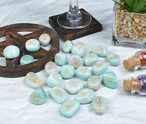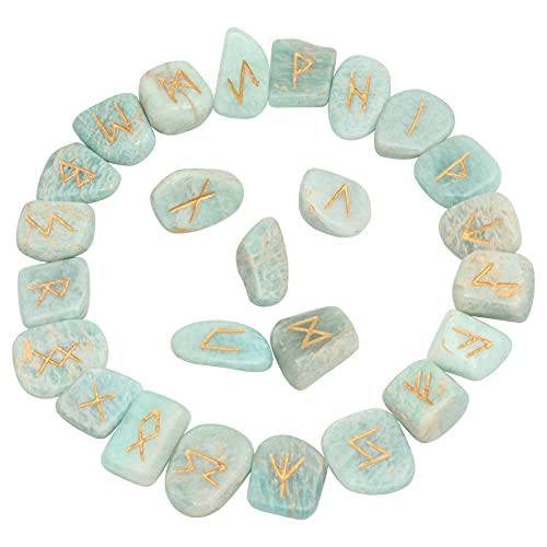 FASHIONZAADI Pietre runiche Naturali dell'amazzonite incastonate con Alfabeto runico Futhark a Forma di Pietra runica per Cristallo Reiki Healing Fortune Telling Set Regalo Spirituale Size 15-20mm