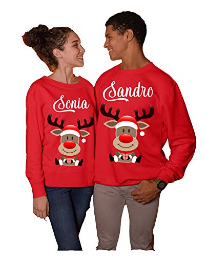Fashwork Coppia Felpe Girocollo Natale Natalizie Lui e lei Personalizzabile - PERSONALIZZA con Il Tuo Nome - Renna - Rudolph - Idea Regalo Natale