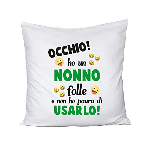 Fashwork Cuscino Divertente Occhio Ho Un Nonno Folle e Non Ho Paura di usarlo - Idea Regalo - Dimensioni 40x40 cm
