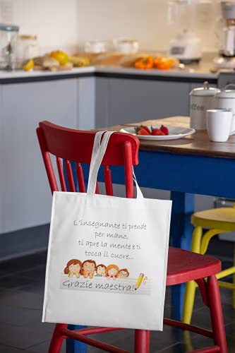 SHOPPING BAG MAESTRA: Questa shopping bag è una simpatica e divertente idea regalo per dire grazie a chi ci ha dato dei consigli, rimproverato quando serviva e aiutato a crescere. La nostra shopping bag è 100% in cotone, lunghezza del manico: 40 cm. dimensioni: 38 x 42 cm capacità: 10 litri gr 142.