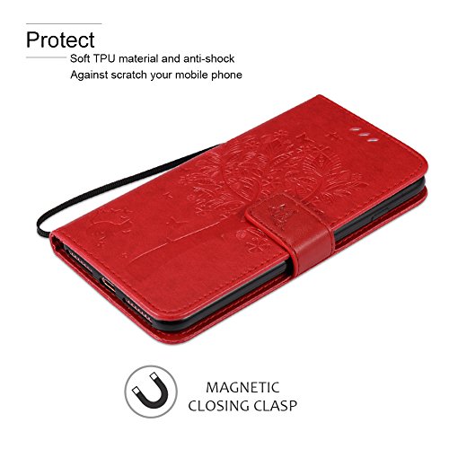 Fatcatparadise Cover iPhone 8 Plus/iPhone 7 Plus [Vetro Temperato Screen Protector], (Gatto e Albero Serie) Retro Flip Caso Custodia Silicone PU per Apple iPhone 8 Plus/iPhone 7 Plus (Rosso)
