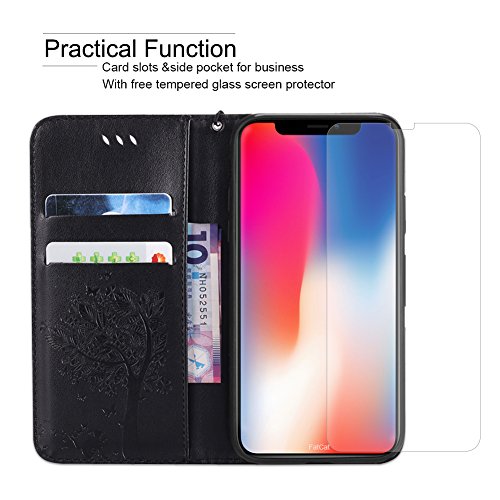 Fatcatparadise Cover iPhone XS/iPhone X [Vetro Temperato Screen Protector], (Gatto e Albero Serie) Retro Flip Caso Portafoglio Custodia Fondina Silicone PU per Apple iPhone XS/iPhone X (Nero)