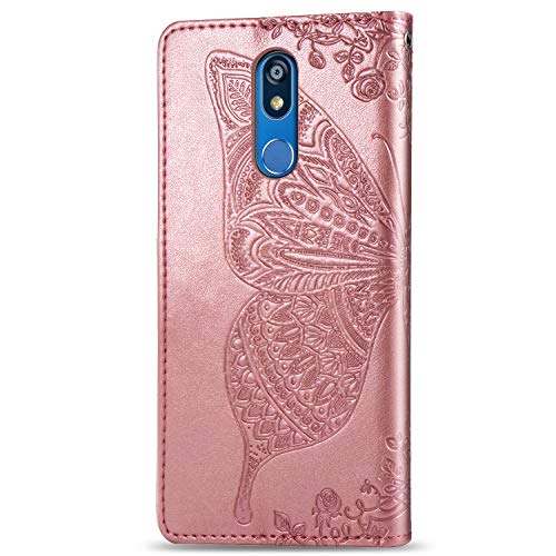 Fatcatparadise Cover per LG K40 [con Pellicola in Vetro Temperato], Farfalla Retro Flip Custodia Pelle PU e TPU Silicone [Funzione Supporto][Magnetica] (Oro Rosa)