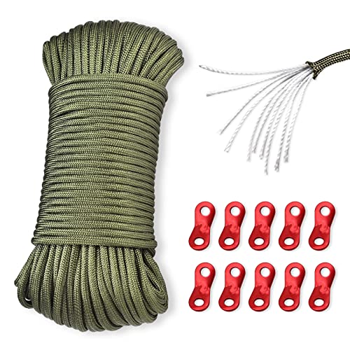 Fatiya Corda paracadute in paracord da 294,8 kg con 10 tendicavo in alluminio, 10 fili da 4 mm Mil-Spec in nylon Paracord resistente, Guyline di sopravvivenza corda verde per campeggio all'aperto