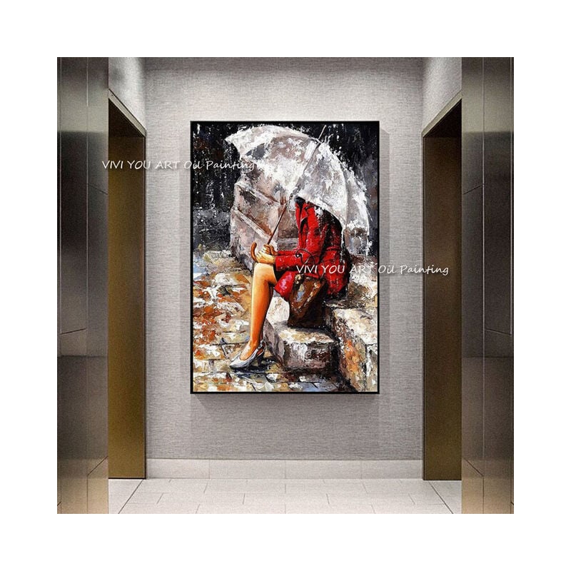 100% fatto a mano Dropshipping la gonna rossa donne sotto la pioggia figura vernice pittura a olio fatta a mano immagine di arte della parete decorazioni per la casa,60x90cm unframed,01