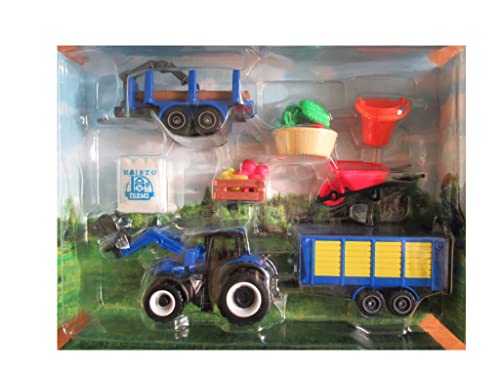 Set Fattoria Diecast TRATTORE NEW HOLLAND Blu con rimorchi e altri accessori - Scala 1:64 - Lunghezza 16 cm con rimorchio