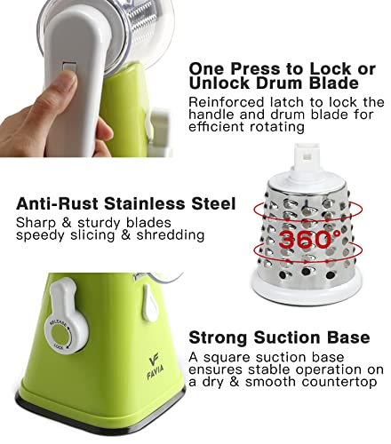 FAVIA Grattugia per Formaggio Rotante, Affettatrice rotanteper Verdure Manuale, con 3 Lame a Tamburo in acciaio inox,mandolina,tritatutto,grattugie,per verdure frutta (verde)