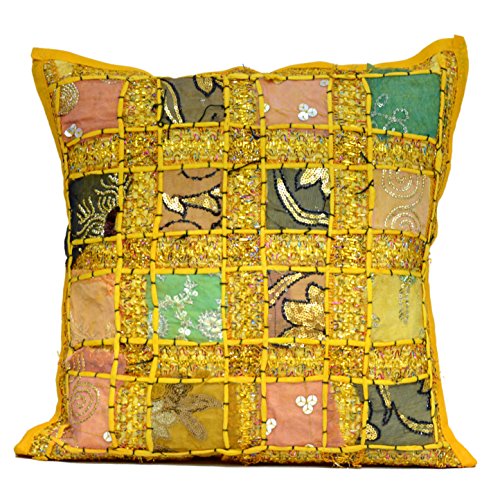 Federa per cuscino da divano, con motivo patchwork, ricami in stile etnico e paillettes Tradizionale Yellow