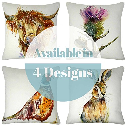 Federa per cuscino con stampa ad acquerello, 100% cotone, design con stampa ad acquerello ispirata dalle Highland Scozzesi, 43 cm x 43 cm, progettato nel Regno Unito, disegno artistico realizzato da Sarah White©, 100% Cotone, Hare, 45 x 45 cm