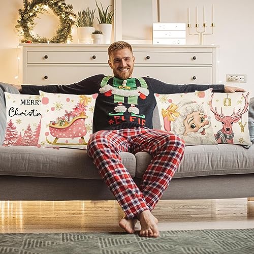 Federe per cuscini rosa, 4 federe per cuscini con Babbo Natale con cerniera, fodere per cuscini in cotone e lino, federe per cuscini natalizi, federe per cuscini morbidi per soggiorno, camera da letto