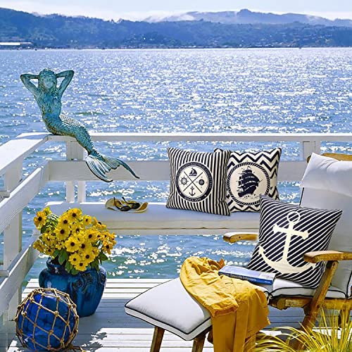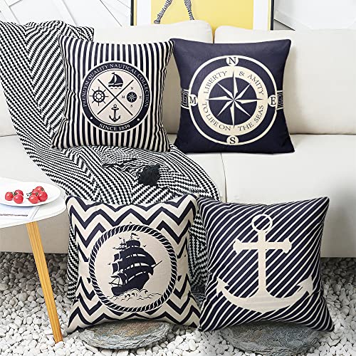 Set di 4 Federe Cuscini Divano 50x50 Impermeabile Esterno Lino Copricuscini Per Divano Nautico Ancora Bussola Timone Navigazione Federa Decorativa per Giardino Decorazione Della Casa (Blu Strisce)