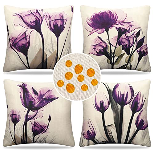 Federe Cuscini Divano 40 x 40 Floreale Impermeabile Lino Esterno Fodera Cuscino Moderno Decorativi Fantasia Viola Astratto 4 Pack Primavera Estate Copricuscini Divano per Ufficio Giardino Soggiorno