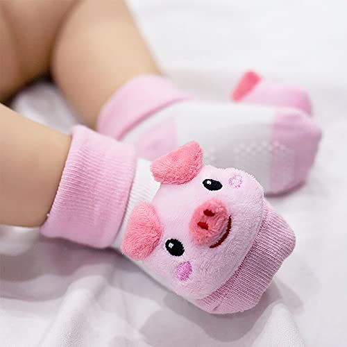 FedMois 3 Paia Calzini con Sonaglio Antiscivolo in Cotone Bimbi Neonati, dinosauro, porcellino e gatto, 0-6 mesi