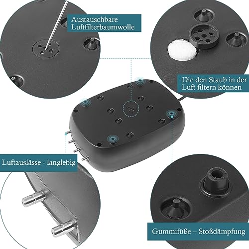 [Accessori completi] Questa pompa ad aria per acquari è dotata di un tubo d'aria morbido lungo 1,5 m, 4 pietre d'aria, 4 valvole di non ritorno, 4 valvole di regolazione, 4, ventose, 4, un raccordo a T, 2 e un ovatta filtro dell'aria, per soddisfare le vostre diverse esigenze. [Lunga ] Il cuscinetto in cotone filtrante nella presa d'aria inferiore della pompa dell'aria può contaminazione Blocca efcemente l'aria e prolunga la della pompa ad aria..