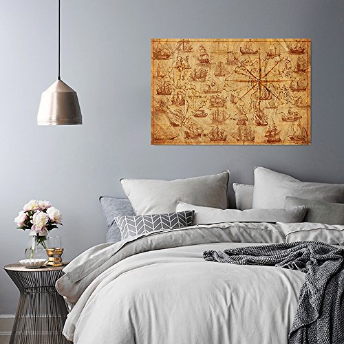 Feeby Frames, Quadro Pannelli, Pannello Singolo, Quadro su Tela, Stampa Artistica, Canvas 70x100 cm, Vintage, Mappa del Mondo Marittimo, Bussola, Navi, Seppia, Marrone