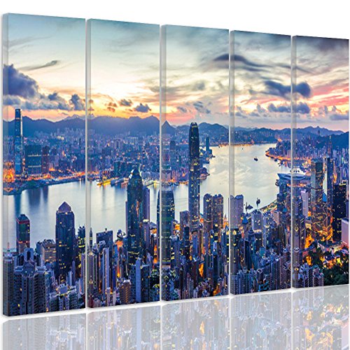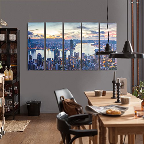 Feeby Quadro Su Tela New York 5 Pezzi Tipo C 200x100 cm Stampa Murale Immagini Moderni per Soggiorno Camera da Letto Cucina Architettura Città Paesaggio Panorama Cielo Edifici Grattacieli Azzurro