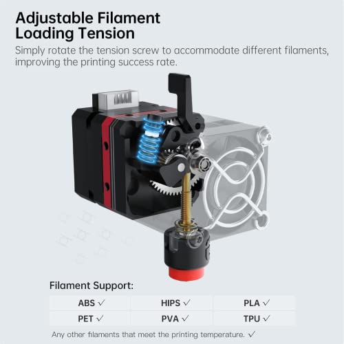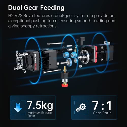 Tensione di carico del filamento regolabile e alimentazione a doppio ingranaggio: basta ruotare la vite di tensione per abbinare diversi filamenti, migliorare il tasso di successo, migliorare le prestazioni di stampa dei filamenti flessibili, compatibile con la maggior parte dei filamenti sul mercato, come ad esempio: ABS/PLA/PVA/HIPS/PET/PET ecc. 7:1. 7,5 kg. Per estrusione Force, H2 V2S Revo dispone di un sistema a doppio ingranaggio per fornire una forza di spinta eccezionale, garantisce un'alimentazione liscia e una riduzione degli urti.