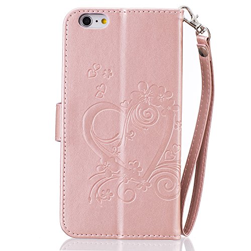 Feeltech Cover iPhone 6 / 6S Plus 5.5 Portafoglio Ribaltabile Wallet Custodia Pelle Sintetica Coperture Soft Bumper Interno TPU Supporto Moda Sbalzato Cuore Serie Farfalle Case - Oro Rosa