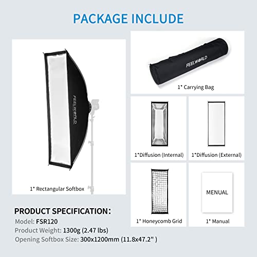 FEELWORLD FSR120 Softbox rettangolare, rettangolo 30x120cm per FEELWORLD FL125D FL125B FL225D FL225B e altre luci da studio video con attacco Bowens, per live streaming, videografia, fotografia